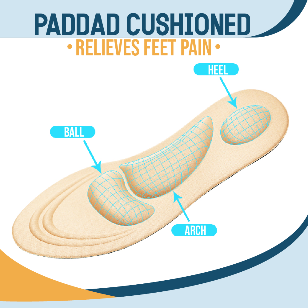 Our innovative 4D Comfort Cushioned Insoles are specially design for distributing pressure and alleviating pain associated with flat feet, heel or arch pain and discomfort, sore and aching feet caused by long time walking or standing.