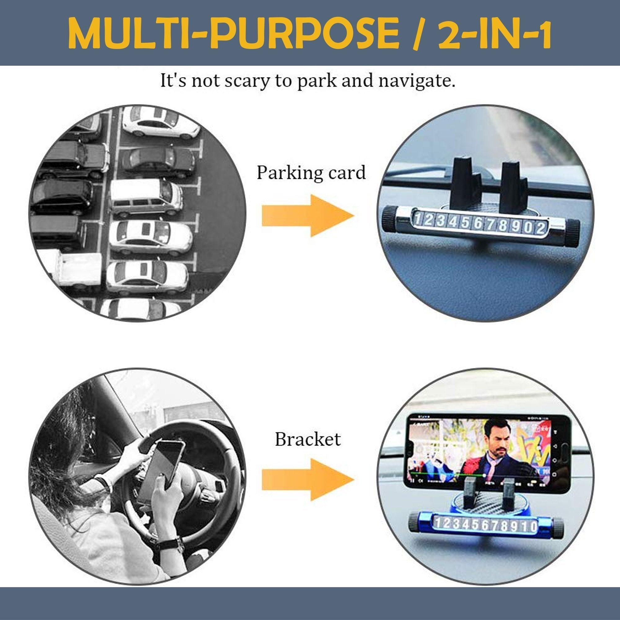 The Temporary Parking Card Car Phone Holder is a 2-in-1 device. It functions as a car dashboard phone holder and a temporary parking plate. It is portable and features luminous numbers that are visible day and night.